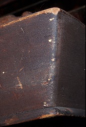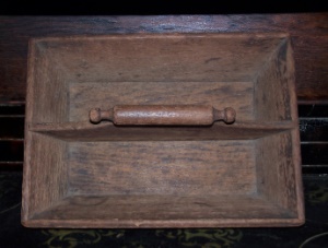 As you see it is exactly as I found it all those years ago. Present you will find the old dry madder brown paint in tact, while the interior and bottom are nicely worn and aged. It was nail constructed, with a divided interior and overly canted sides.