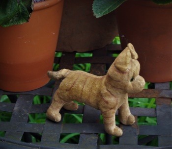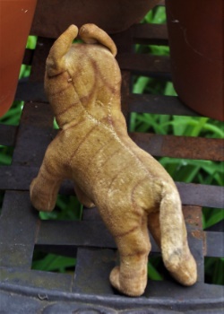 This little cat measures just 6" long (not including his tail) x 5" tall. He is stuffed with either excelsior, straw or something similar, but not fabric or cotton!