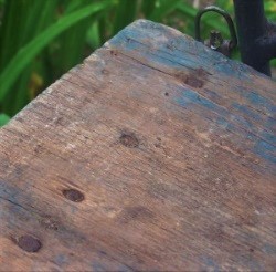 Measuring 16 3/4" wide x 6 3/4" deep x 9" tall, it retains traces of it's old blue paint. It is mostly square nail constructed with some irregular. Because the original was missing, the hanger hardware was more recently added. ($265)