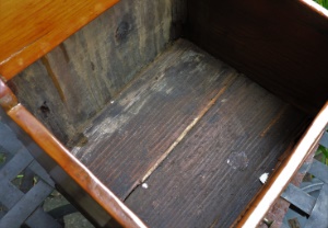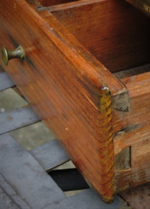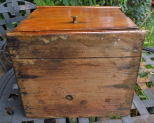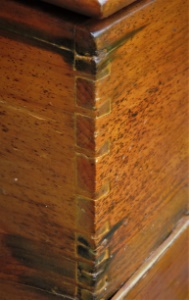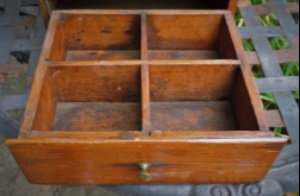 This early box displays early dovetailed construction, as does the divided spice drawer. We believe the wood type to be pumpkin pine.