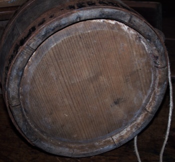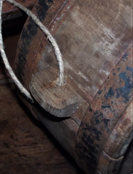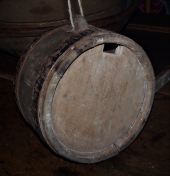 Measuring 8 1/2" x 5 1/2",it was constructed like a wooden barrel, fit together with precision and held with early iron bands. As an extention of one of the staves you will find a piece that, through a hole likely fit a leather strap for hanging. That too would allow the canteen to be worn across the body when in use in the field.