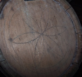 In addition, there is a pencil decoration (as shown) on one side reminecent of those found on a Pennsylvania Dutch barn or perhaps a quilters star. There is a squarish cut-out "filler" hole on the opposite side, which may or may not have had a stopper.