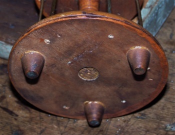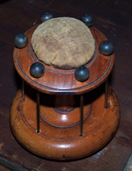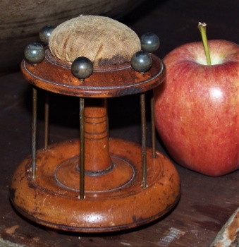 This piece still retains the original pincushion as well as 6 pins that hold the spools of thread. It measures 4" tall while the base measures 3 3/4".